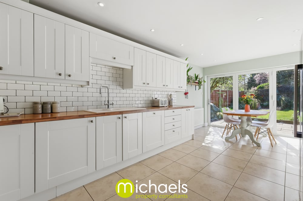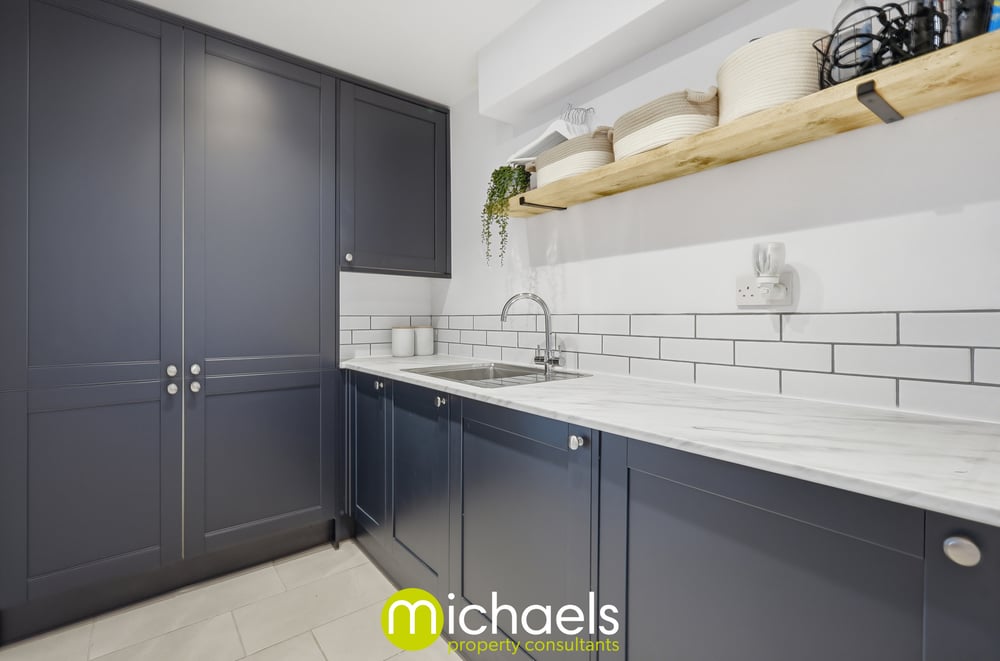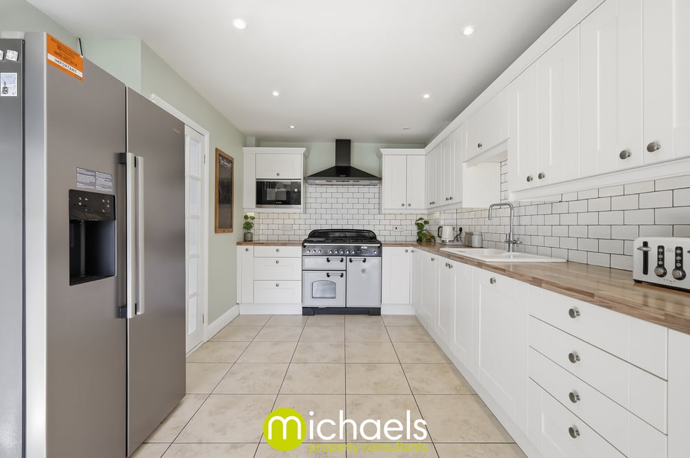 A stunning 19’ kitchen/dining/breakfast room provides the heart of the home, featuring shaker-style units, tiled splashbacks and flooring, and impressive bi-folding doors leading out to the south-east facing rear garden. This bright and sociable space also offers room for a freestanding American-style fridge freezer and a range-style cooker.
