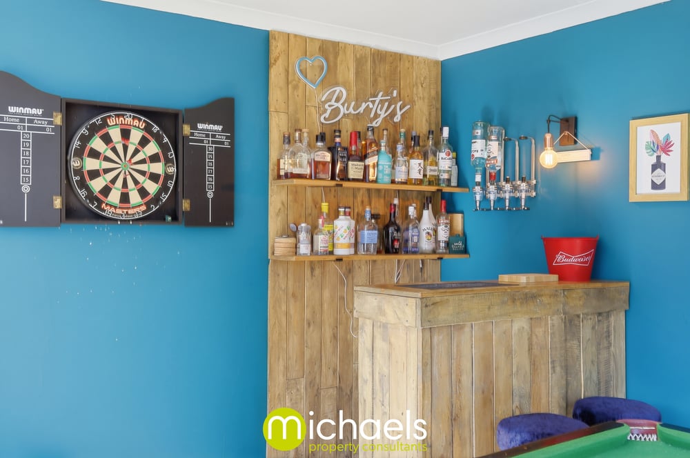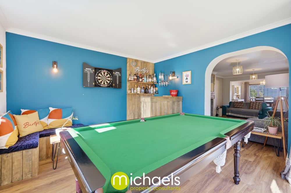 The main reception room is a standout feature, filled with natural light from dual-aspect windows and centred around an inset wood-burning stove. This generous space comfortably accommodates both a cosy living area and a formal dining space. To the rear, a versatile additional reception room—currently used as a games/family room—offers flexibility as a snug, playroom, or home office, with patio doors opening onto the garden.