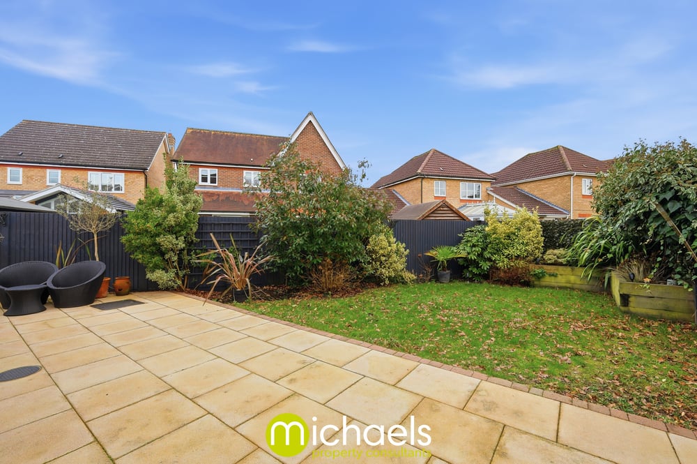 A generous, private, and enclosed rear garden with a large patio ideal for al fresco dining and entertaining, laid to lawn with panel fencing and hedging. Side access leads to a front driveway providing off-road parking and the benefit of a garage.