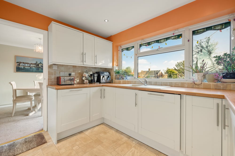 10' 6" x 10' 2" (3.20m x 3.10m) Window to rear, half glazed door to side, a range of fitted units and drawers with worktops over, inset sink and drainer, inset hob, extractor, fitted oven, integrated appliances, matching eye level units, storage cupboard.