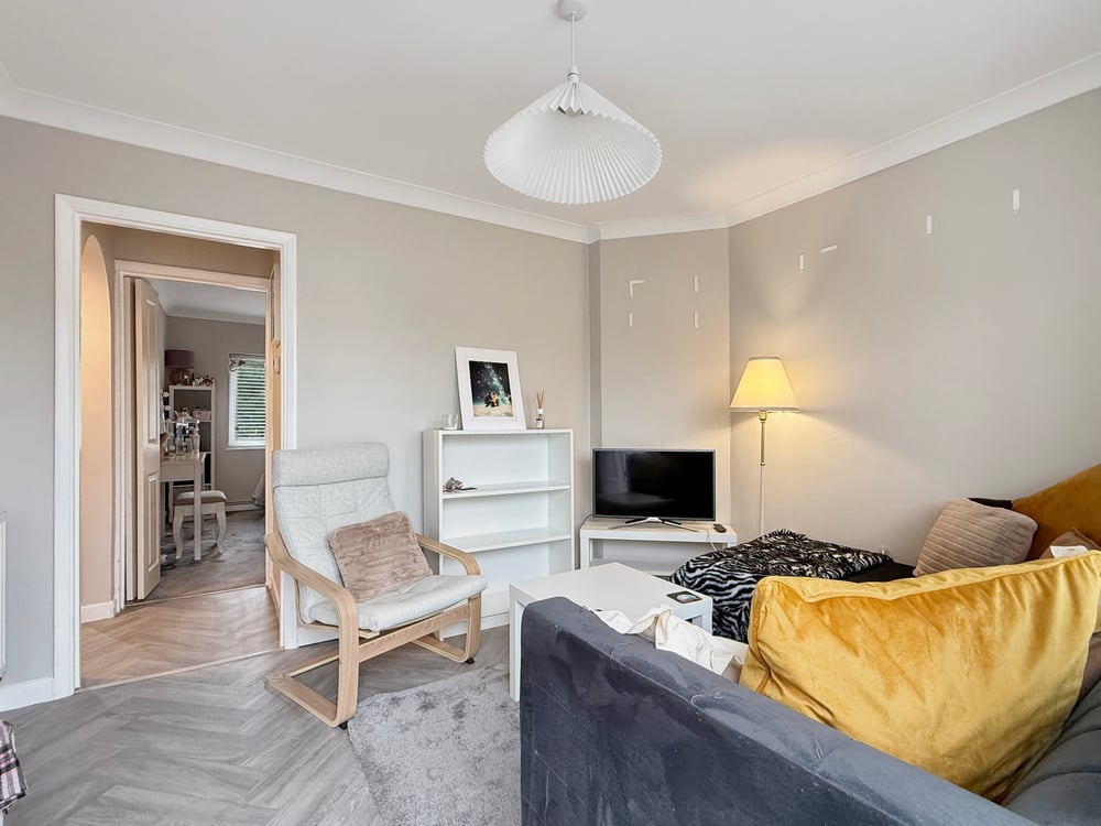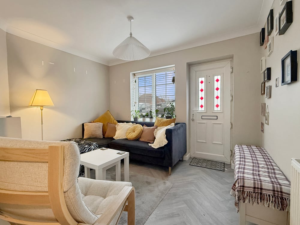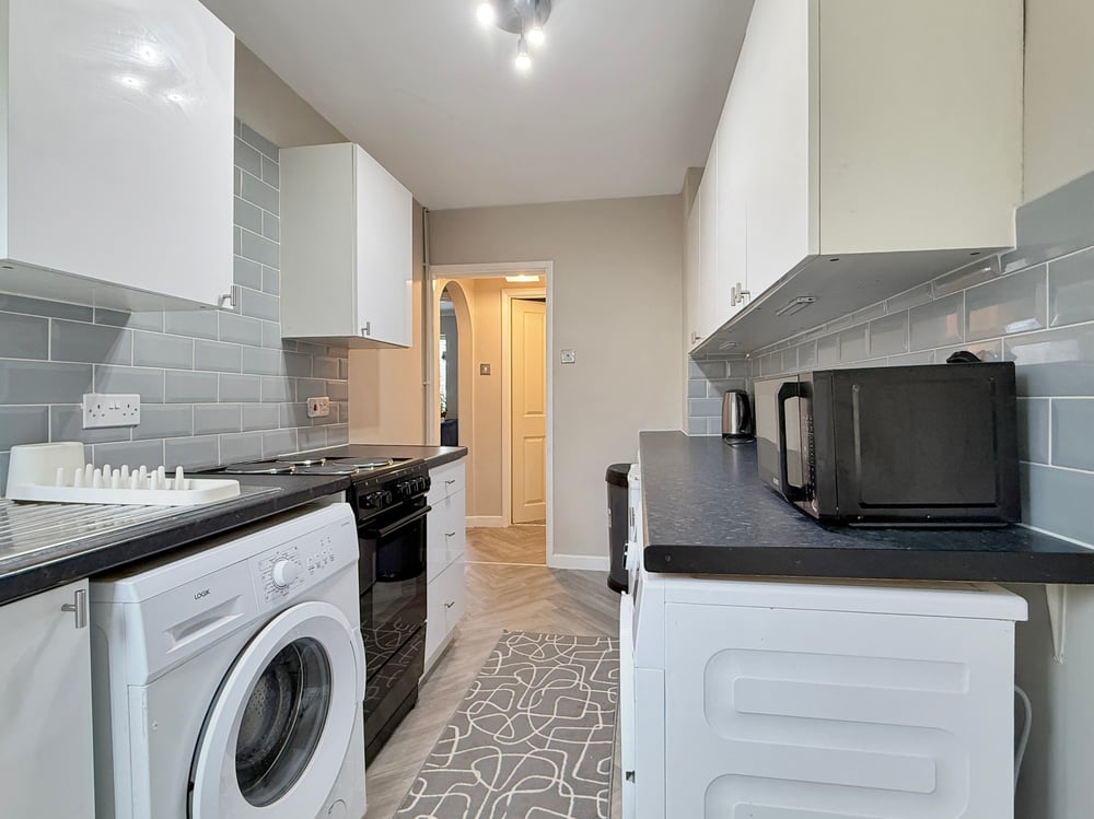The internal accommodation comprises a well-appointed sitting room, a modern kitchen finished with stylish high-gloss units, two well-proportioned bedrooms, and a contemporary bathroom suite.