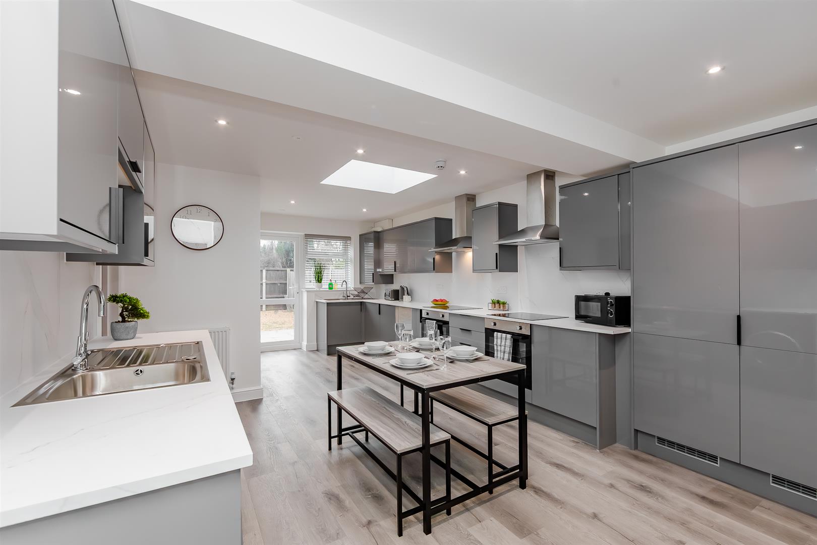 The shared kitchen has been fully equipped with two ovens, two washing machines and extra-large fridge/freezers, ensuring plenty of convenience for all occupants. The kitchen further benefits from a dining area, and a smart TV.